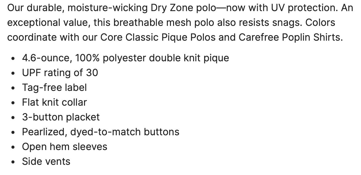 * 4.6-ounce, 100% polyester double knit pique/Moisture wicking technology