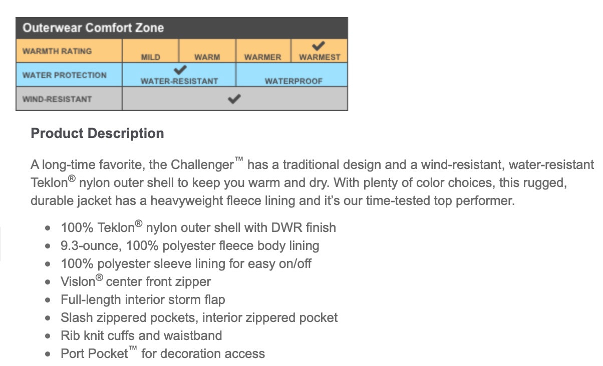 *Ā 100% TeklonĀ® nylon outer shell with DWR finish